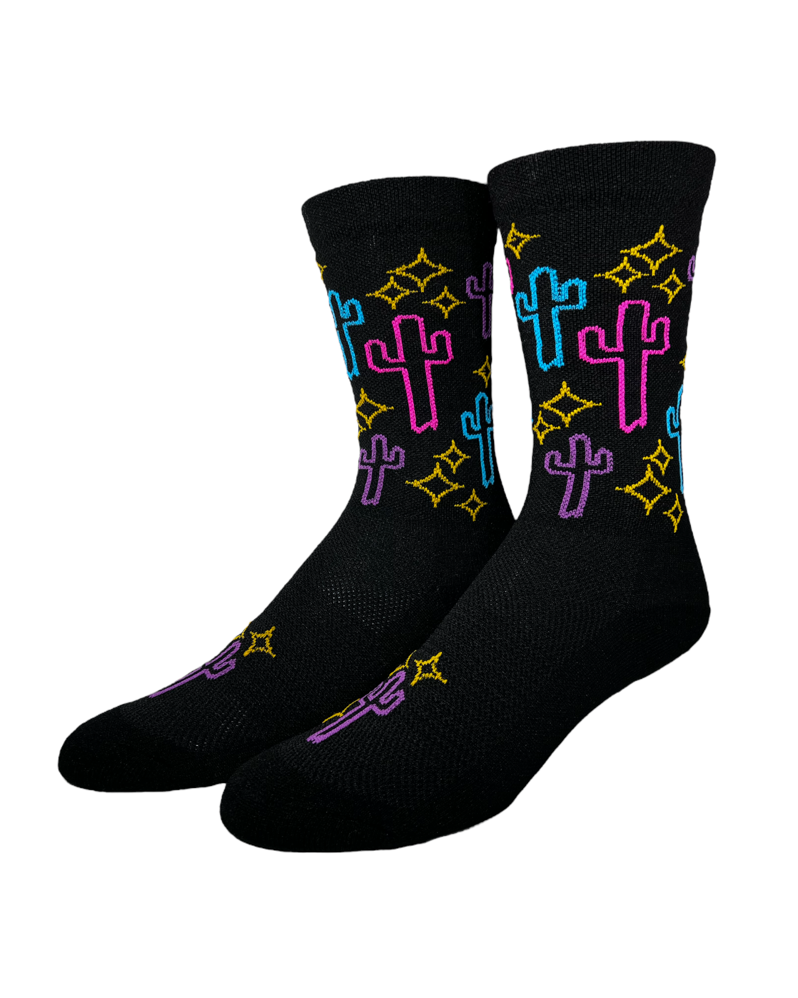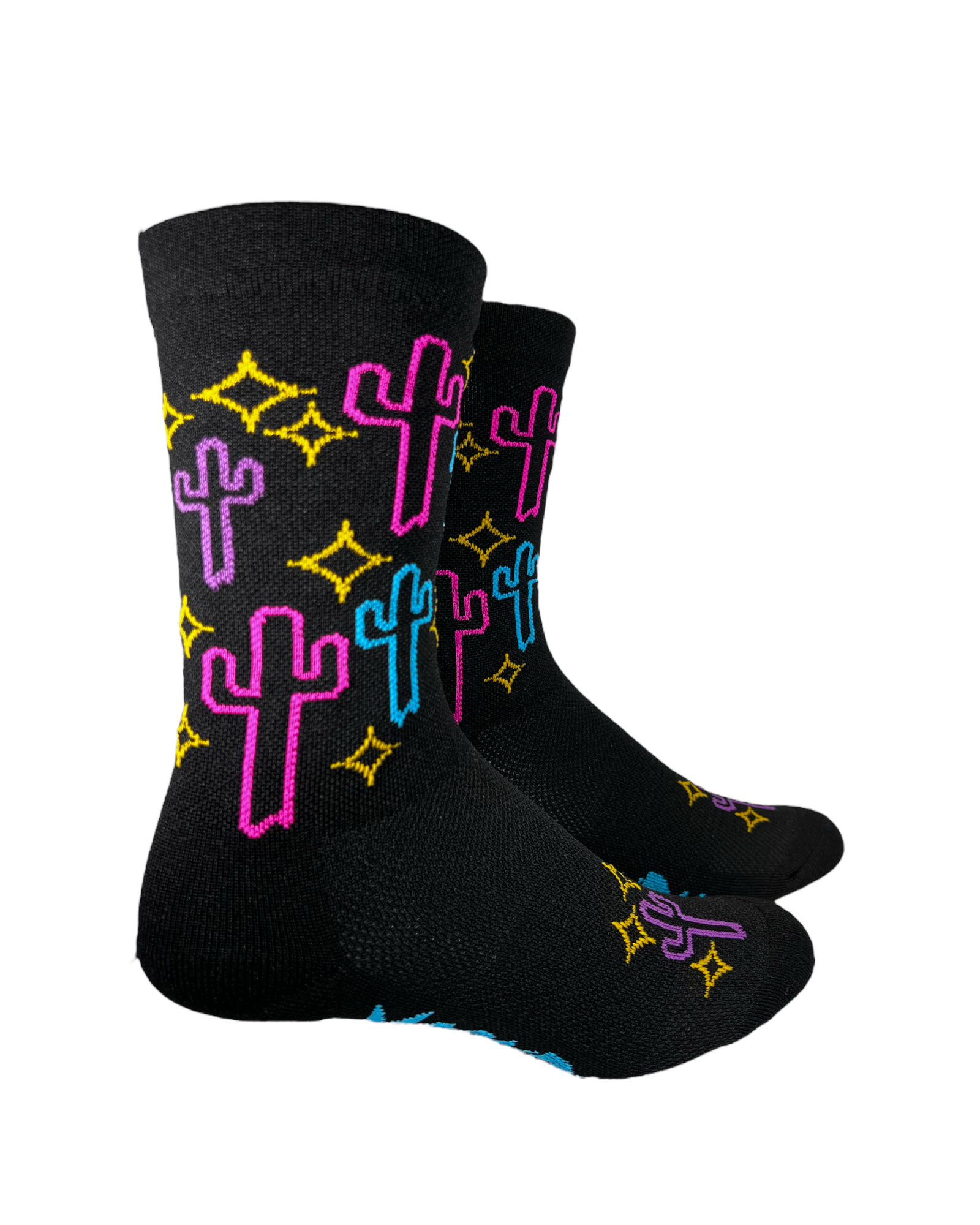 The Saguaros return with a fun pattern of the iconic cactus in neon pink, purple, process blue and some gold stars on a black base!