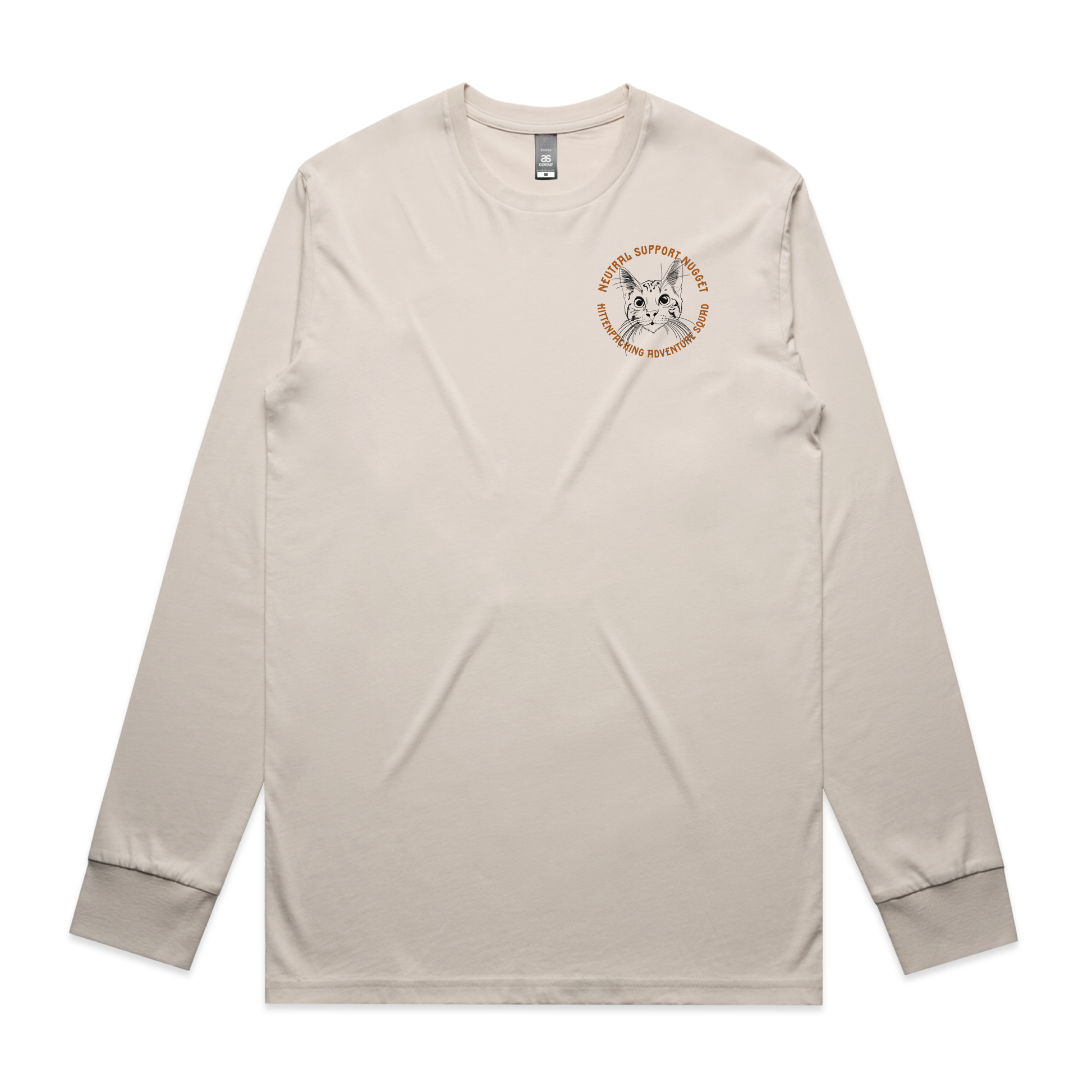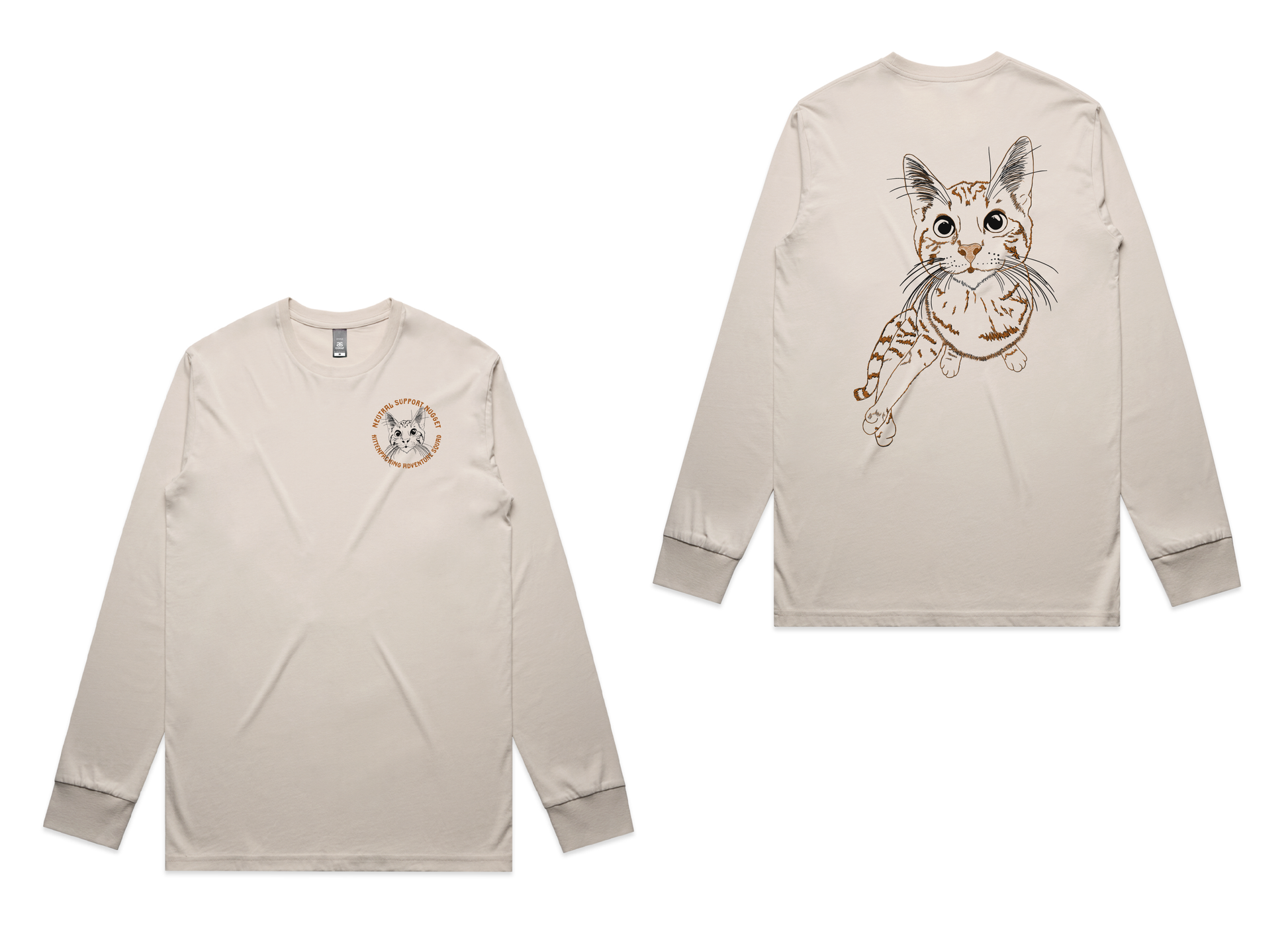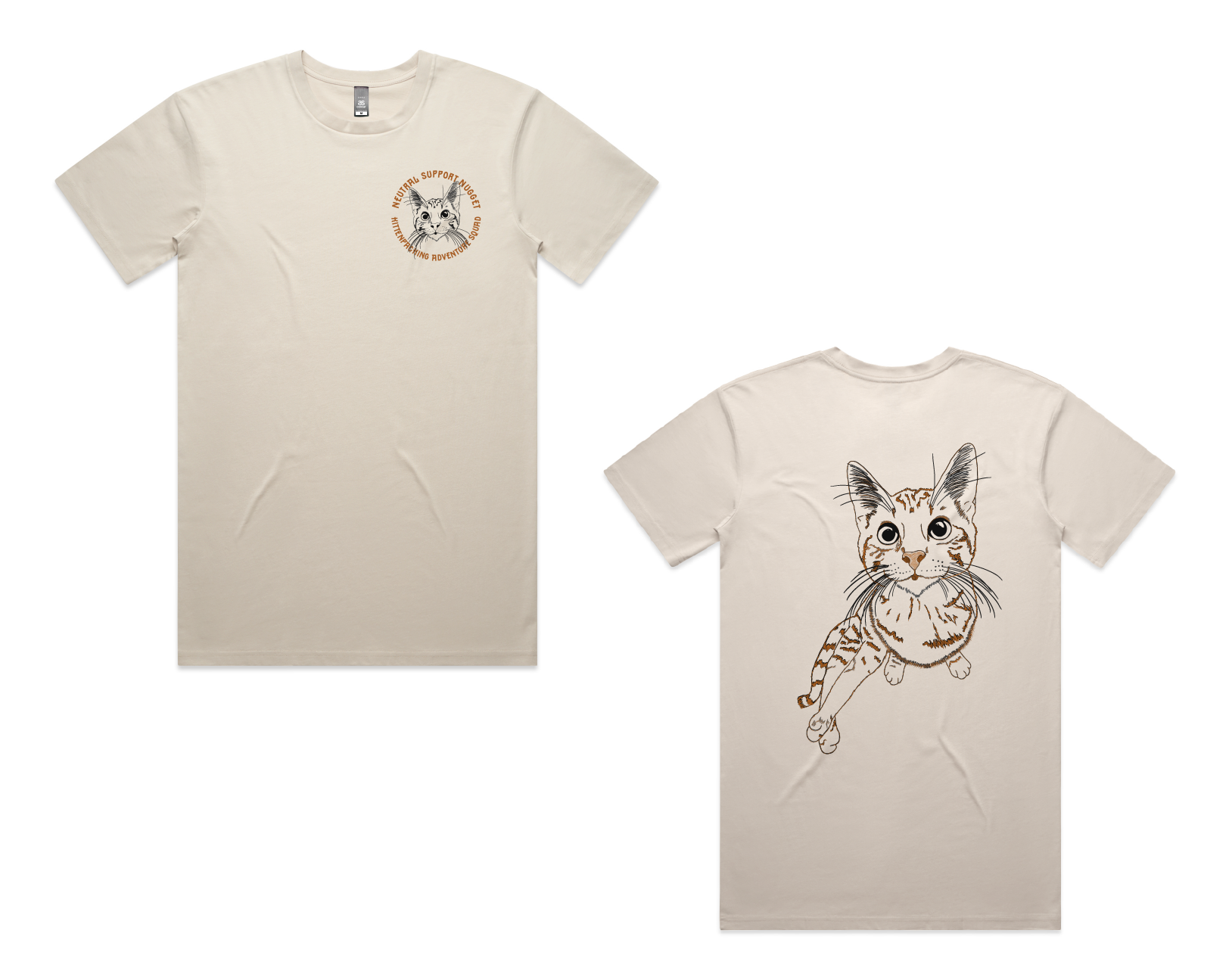 Kittenpacking Adventure Squad shirt number 2 is front and back Black and Burnt Orange (straight out of her coat colors) on a Bone As Colours Staple Tee in both Short Sleeve and Long Sleeve.