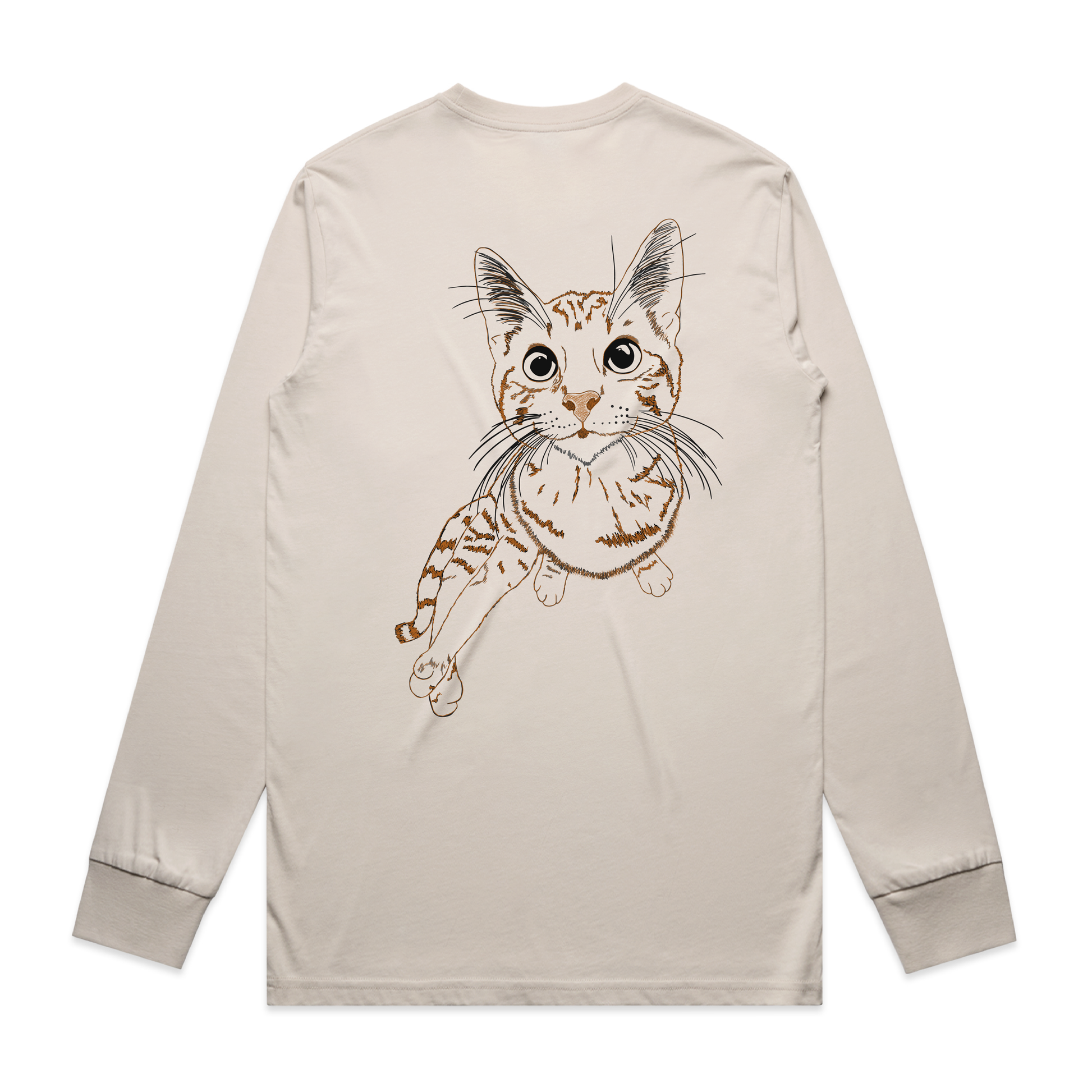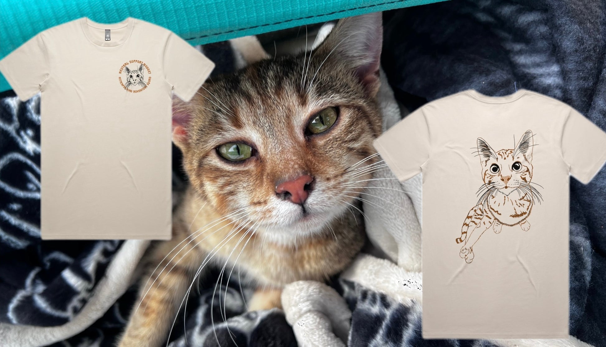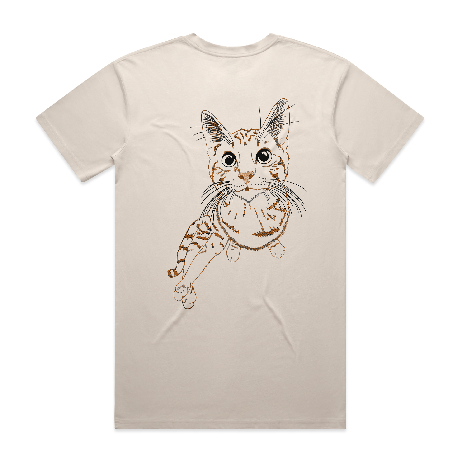 Kittenpacking Adventure Squad shirt number 2 is front and back Black and Burnt Orange (straight out of her coat colors) on a Bone As Colours Staple Tee in both Short Sleeve and Long Sleeve.